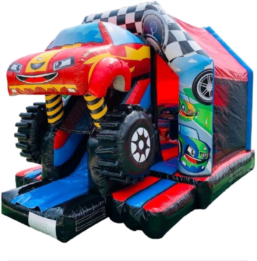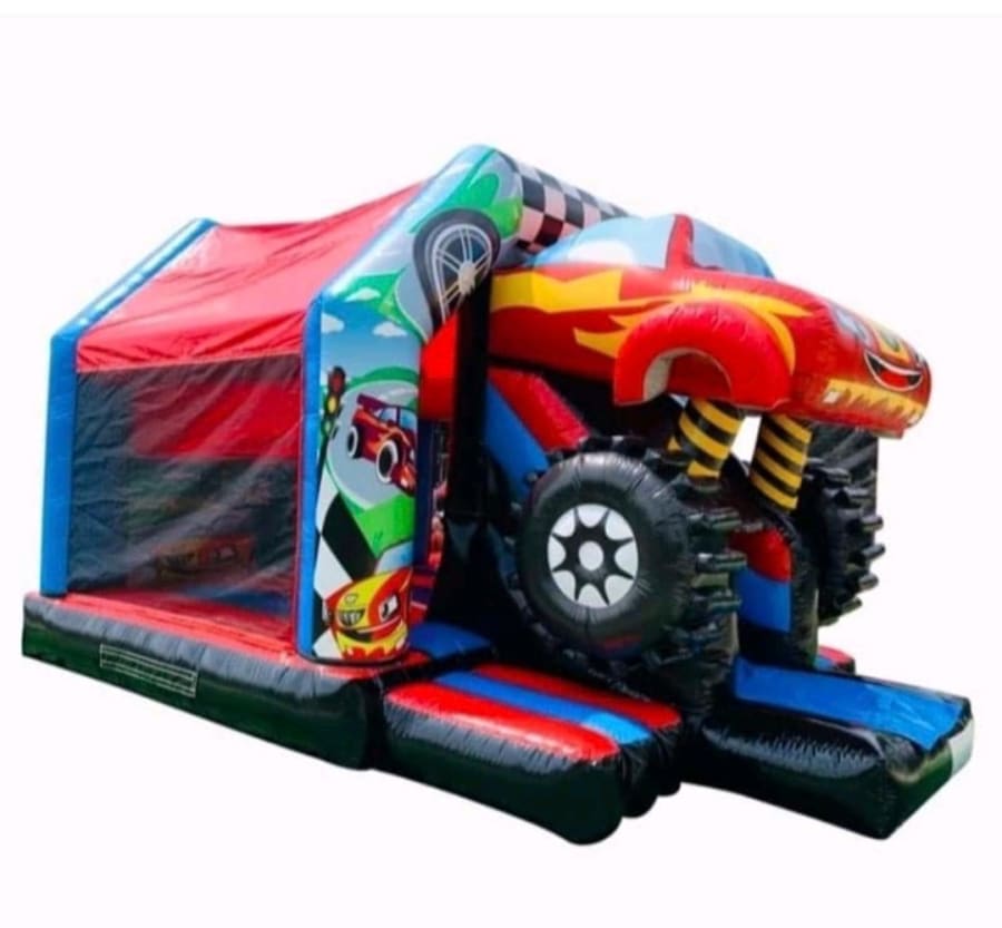 This monster car front exit slide bouncer is awesome imagine the look on your children's face as they see it set up an ready to be bounced on